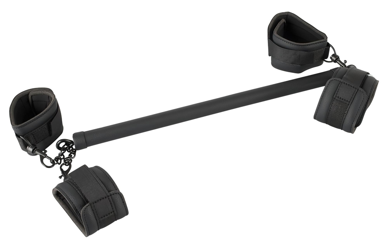 Divoké svazovací zážitky – plné vzrušení a touhy z naprosté odevzdanosti! Proč si to zamiluješ? Vysoce kvalitní materiál s precizně zpracovanými okrajiIdeální na bondage fantazie i nápadité hrátky ve dvouPárový sex tu získá novou, napínavou podobuSkvělé pro začátečníky i pokročilé v BDSMNabízí různé možnosti svazování a uchyceníMěkké, polstrované pouta zaručí pohodlí i bezpečné omezení pohybuPouta mají kovové D-kroužky a malé karabinky pro snadné uchyceníNa co si dát pozor: Při čištění použij pouze vlhký hadřík, v případě potřeby dezinfekci pro erotické pomůcky (objednávací kód: 8718627520062) – před použitím ji setři z povrchu.Tyč má pevnou délku, není nastavitelná.Karabinky na poutech nejsou odnímatelné. Co najdeš v balíčku? 1× pevná spojovací tyč1× krátký kovový řetízek2× (1 párový set) pouta na zápěstí2× (1 párový set) pouta na kotníkySpecifikace & vlastnosti: kvalitní umělá kůžepečlivé kvalitní zpracovánívelikost pout nastavitelná na suchý zipcelková délka pout na zápěstí včetně pásku: 33 cmrozměry pout na zápěstí (bez pásku): 24 × 5,6 × 0,5 cmcelková délka pout na kotníky včetně pásku: 38 cmrozměry pout na kotníky (bez pásku): 29,3 × 5,8 × 0,5 cmmasivní spojovací tyč z pevného materiálu, na koncích možnost uchycenídélka tyče: 40 cmprůměr tyče: 2,2 cmdélka řetízku: 10 cmhmotnost: 370 gbarva: černá se stříbrnými kovovými prvkymateriál: Polyuretan, kov