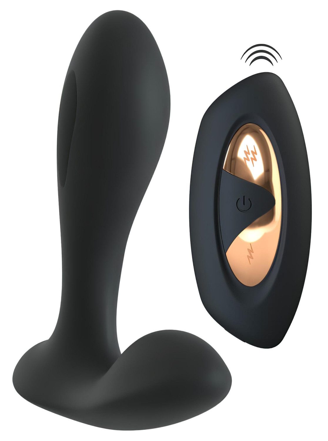 Objev vzrušení elektrostimulace s tímto nositelným vibrátorem na G a P bod, který posune tvé potěšení do nové dimenze! Proč to chceš? Ideální pro ženy, které dosáhnou orgasmu pouze kombinací vaginální a klitoriální stimulaceUnisex pomůcka – vhodná i pro stimulaci prostaty2 vibrační motorky – jeden ve vnitřní části, druhý pro klitoriální stimulaciOhebná hlaviceOdděleně ovladatelné E-stimulační a vibrační režimyHladké vodivé plochy na špičce vibrátoru přenášejí nízkofrekvenční a středněfrekvenční elektrické impulzy10 režimů elektrostimulace a 10 vibračních režimůJemný silikon, který zajišťuje snadné zavádění a intenzivní stimulaci100% vodotěsný – použití ve vaně nebo sprše, snadné čištěníVestavěný akumulátor – nemusíš řešit baterie – platí i pro ovladač!Rádiový ovladač s dosahem až 5 metrů – můžeš si užít bez použití rukou nebo nechat ovládání na partneroviNa co nezapomeň: Používej pouze lubrikant na vodní báziPřed a po každém použití důkladně očisti a dezinfikujPři skladování nedovol, aby se pomůcka dotýkala jiných produktůJak to používáš? Před použitím nanes lubrikant na vibrátor a opatrně jej zaveď do vagíny nebo análu tak, aby klitoriální část směřovala na klitoris. Vibrační i E-stim funkce můžeš ovládat zvlášť nebo zároveň tlačítky na pomůcce. Ovládání: Najdeš zde 2 tlačítka.Spodní (power) tlačítko podržením zapne/vypne přístroj. Dalším stisknutím měníš vibrační režimy.Horní tlačítko (blesk) dlouhým stiskem zapíná/vypíná E-stim. Dalším stisknutím přepínáš režimy elektrostimulace.Ovládání ovladačem: Jakmile je přístroj v základním režimu, můžeš jej ovládat rádiovým ovladačem.Středové (power) tlačítko dlouze podrž a aktivuješ nebo pozastavíš vibrace; dalším stisknutím přepínáš vibrace.Spodním a horním tlačítkem (ikona blesku) přepínáš režimy elektrostimulace.Jak nabíjet? Vibrátor i ovladač jednoduše nabiješ přiloženým USB kabelem. Nabíjecí konektor je malé perforované kolečko na těle pomůcky, které při prvním použití jemně propíchni koncem nabíječky. Co najdeš v balíčku? 1x vibrátor1x USB nabíjecí kabel1x dálkový ovladačParametry: násaditelný vibrátorpříjemný povrchohebná konstrukcevestavěná bateriedoba nabíjení: 180 minutdoba použití: 60 minutrádiový ovladač – dosah 5 m100% vodotěsný – IPX7: až 30 minut, max. 1 m hloubka2 motorkyE-stim a vibrační programy10 režimů elektrostimulace10 vibračních režimůcelková délka: 12,3 cmzasunutelná délka: 10,4 cmprůměr: 1,7 – 3,3 cmdélka klitoriální části: 8,8 cmbarva: černá se zlatými detailymateriál: silikon, PU, ABS (v souladu s EU normami, bez ftalátů)UPOZORNĚNÍ: Nevhodné pro osoby se srdečními chorobami a těhotné ženy. Uchovávej mimo dosah dětí. Jak čistit? Opláchni vlažnou vodou a jemným mýdlem, poté důkladně opláchni a nech oschnout. Doporučujeme použít dezinfekční čistič (8718627520062) – lze doobjednat zvlášť.